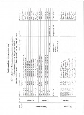 Мектеп сайты » Информация » Шығыс Қазақстан облысы білім басқармасы Аягөз ауданы бойынша білім бөлімінің «Қалалық көпбейінді қазақ мектеп-гимназиясы»КММ-нің спортзал жұмысының кестесі