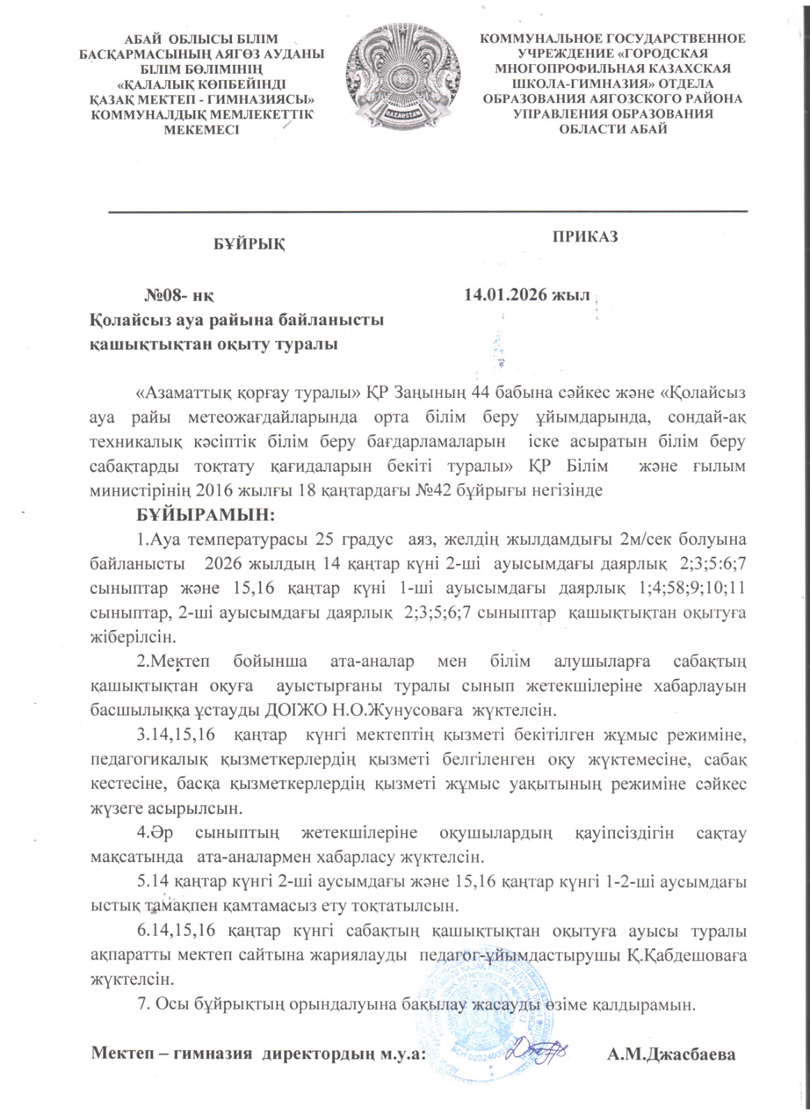 2026 жылдың 16 қаңтарында ауа-райының қолайсыздығына байланысты (қатты аяз) І ауысымдағы 0,1-11 сынып оқушылар қашықтықтан оқытылады.