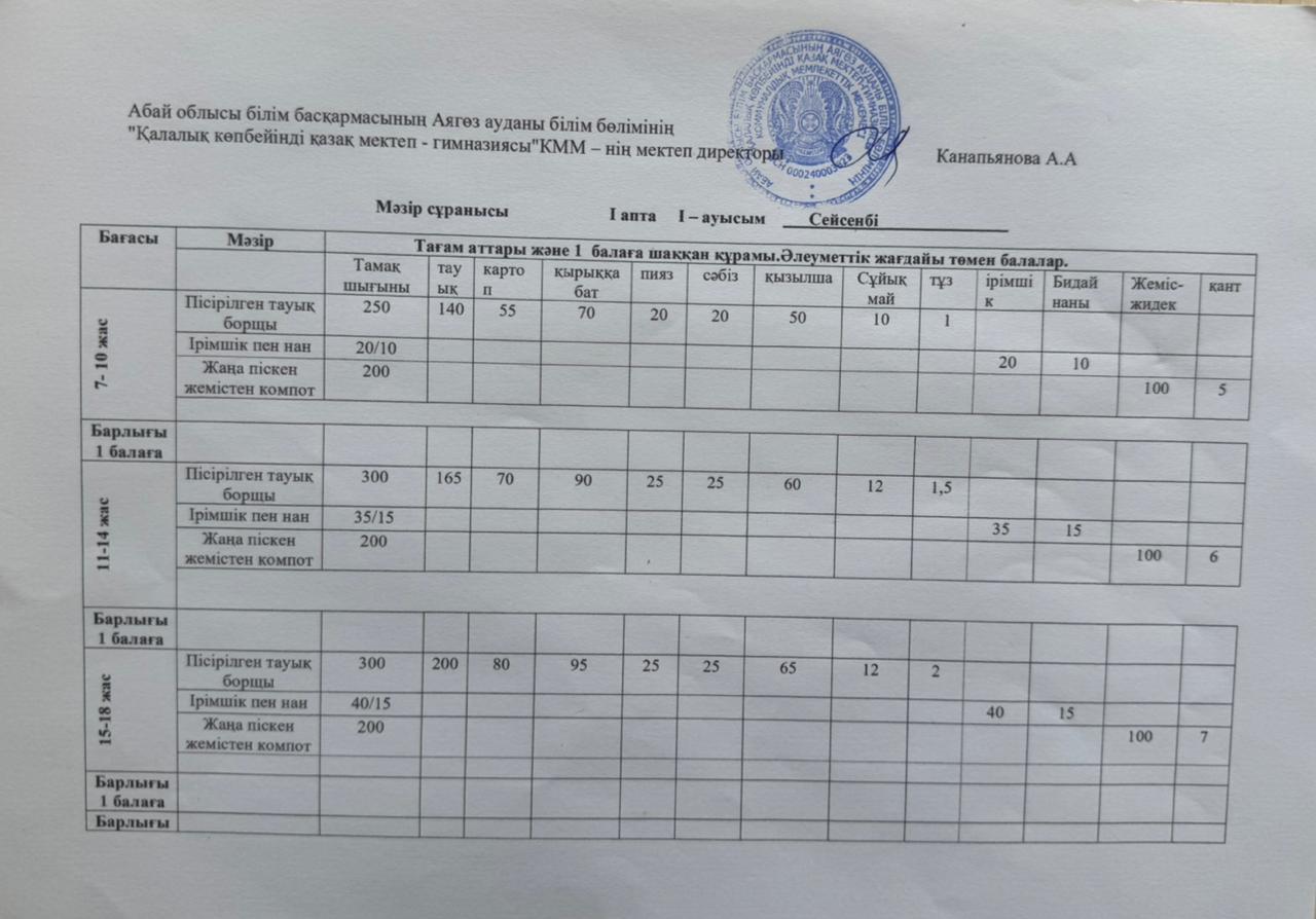 16.09.2025 жылының ас мәзірі
